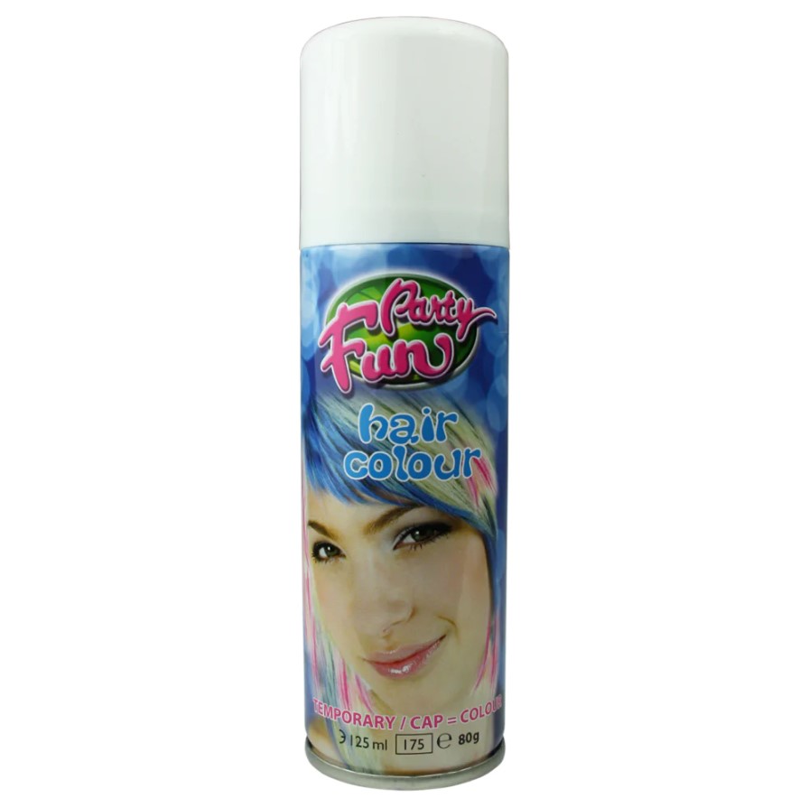 White 125ml. Temporary coloured hair spray perfect for sporting and party events. Easy to apply and wash out.