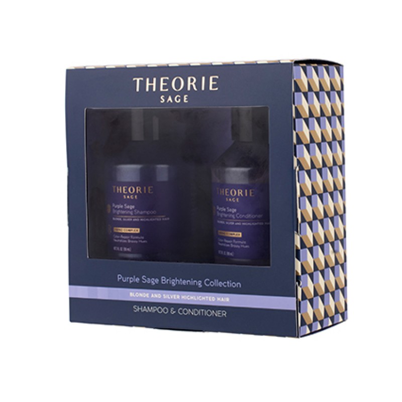 Brighten blonde and silver hair with Theorie Purple Sage Brightening Travel Pack. The on-the-go, travel-sized pack which supports radiance and eliminates brassy tones for brighter, more vibrant highlights, blonde and grey hair. The violet-toned shampoo and conditioner are infused with encircling sage extract, strengthening butterfly pea flower extract, stimulating ginkgo biloba leaf extract and ultra-moisturising grapeseed oil for long-lasting, beautiful results.