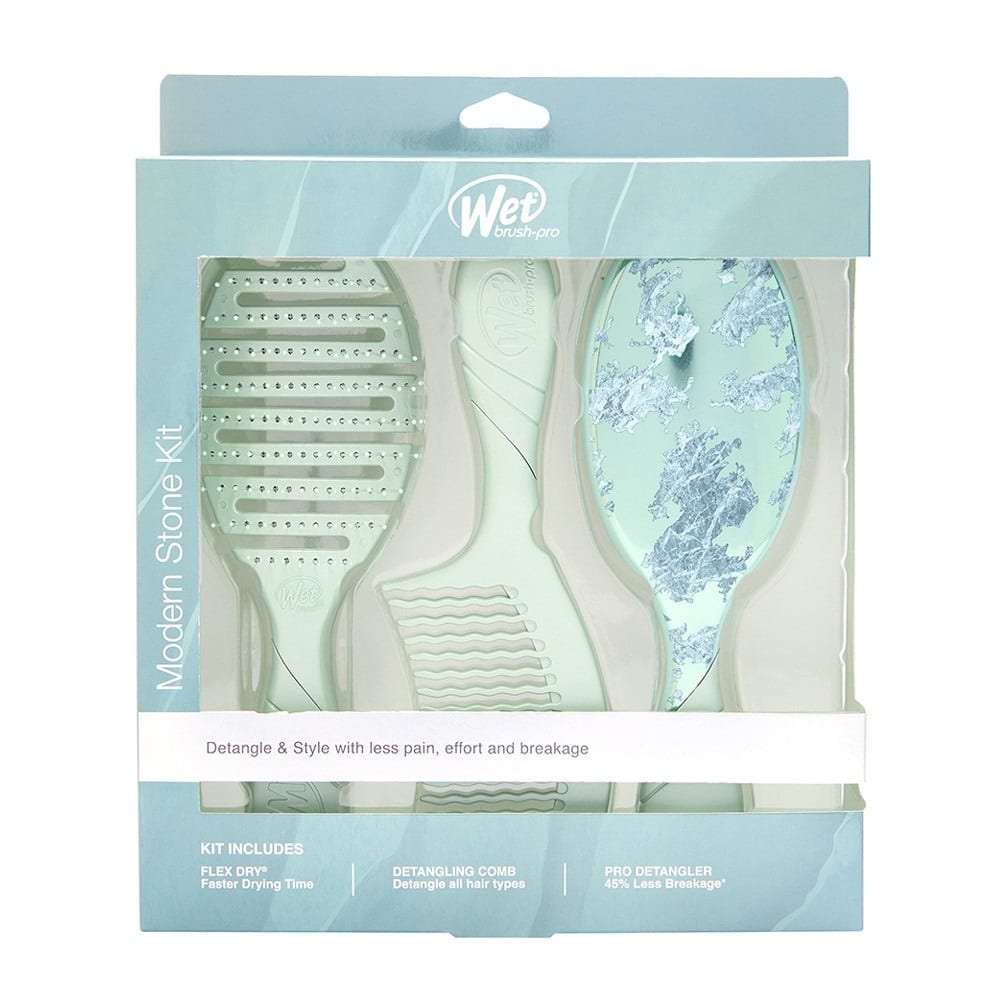 Essentials for stylish detangling with less pain, effort and breakage. WetBrush Pro Modern Stone Kit includes the Pro Detangler in a chic marble inspired print, Flex Dry and Detangling Comb. Pro Detangler’s exclusive, ultra-soft IntelliFlex bristles glide through tangles on all hair types, while heat resistant, snag-free Flex Dry’s vented design speeds up blow-drying time. Wet Brush Detangling Comb features a WaveTooth design to evenly distribute hair across teeth for effortless detangling.